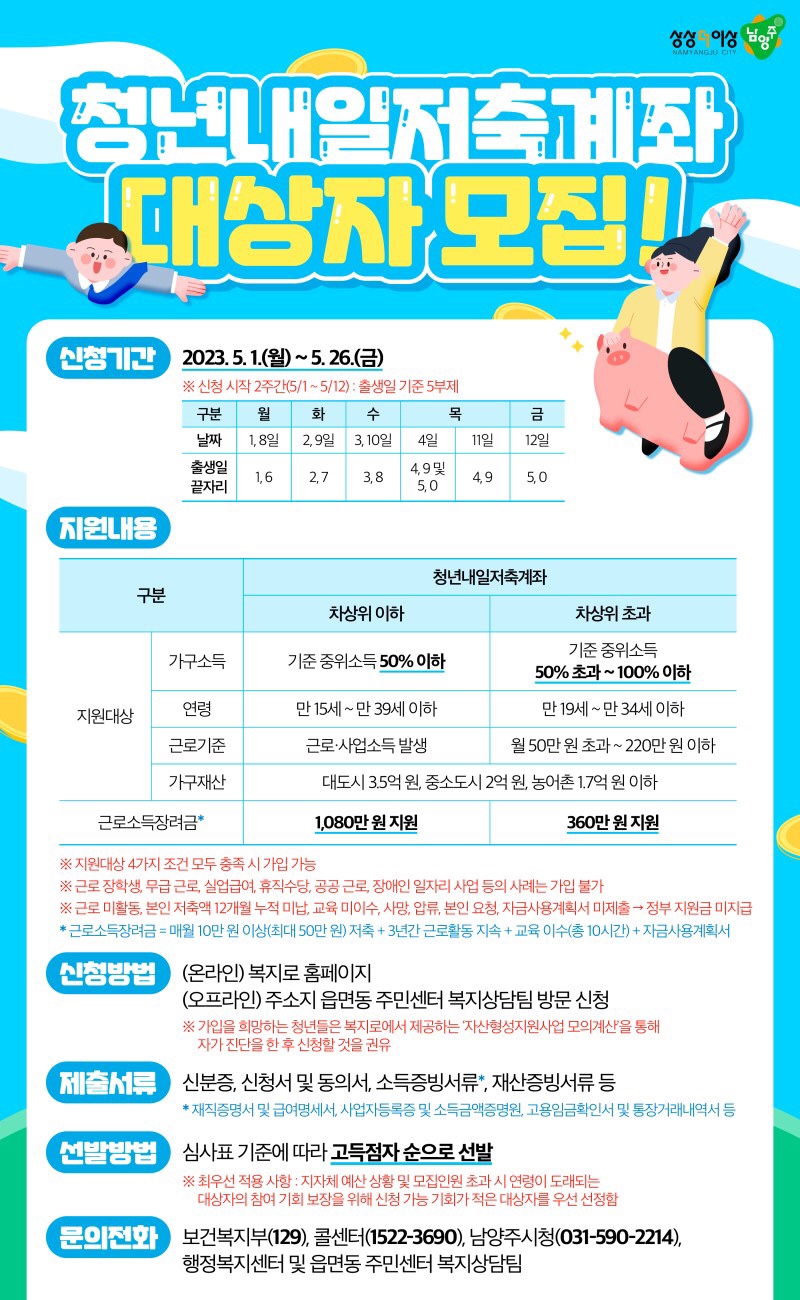 안녕하세요. 남양주 시민 여러분, 앞서 근로장려금에 대해서 알아보았는데요, 반응이 좋아 앞으로 남양주 시민 여러분께 놓칠 수 있는 정책정보나 지역이슈 등을 소개하려 합니다. '청년내일저축계좌'는 보건복지부에서 시행하는 사업으로서, 남양주뿐만 아니라 각 지자체에서 시행하는 기준이 조금 상이할 수 있으니 참고하시길 바랍니다. 지금부터 2023년 청년내일저축계좌 신청기준 및 기간, 지원내용 및 신청방법을 자세하게 공유해 보겠습니다.